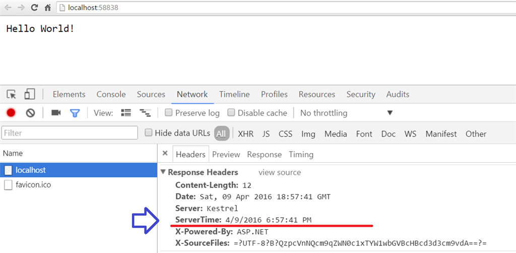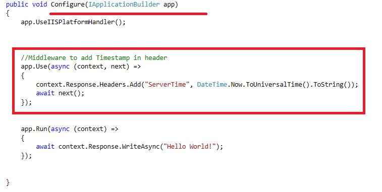 Here's another middleware component added just to add timestamp in header in Configure method in Startup class: