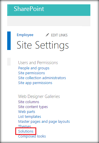 Once we have the WSP file, go to the Site Settings- > Solutions.