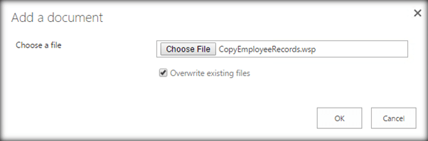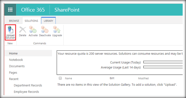 This will open up the Solutions Gallery. Click Upload Solution to upload the WSP saved in the local machine.