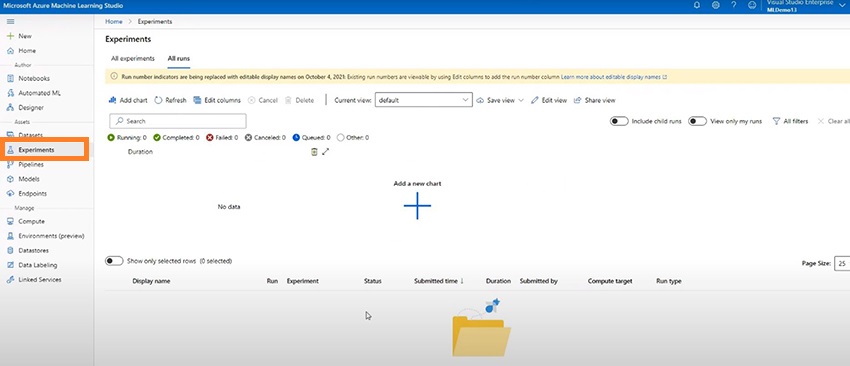 The version control of all the experiments that are created and run are tracked in the experiment section. From submission timestamps to status, the duration for which the experiment was run, the compute target that was used for the experiments; all these log data are available here.
