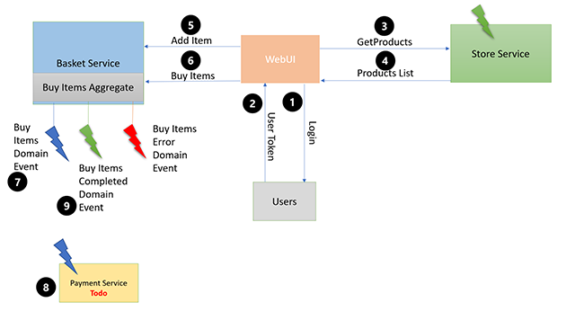 Obviously, this means we have to do everything by ourselves, for example, if you add a product to the basket, then you have to send a domain event which can be procced in the store service and make the product as reserved.