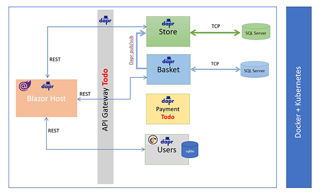 The backend microservices are written in C# (however, it's worth noting that Dapr is language independent), and the frontend is a Blazor. All APIs are REST & HTTP & gRPC based.