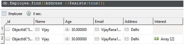 As in the above example in some document, we can have Address column and in another document in the same collection, it's not necessary to have the same column. In short, in a collection, different documents can have different columns/schema. Suppose you want to find out all the documents in a collection where Address column exists. In MongoDB , we have $exist for such queries.