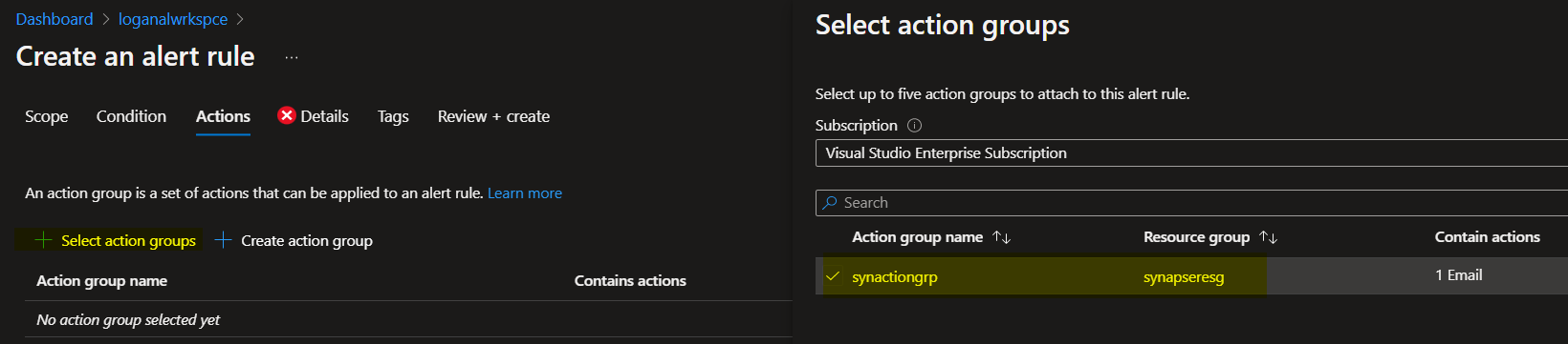 Action Group is where we group actions i.e., either send Email, message, run Azure Functions or Web-hooks etc. I have an action group available already hence I am choosing that, in case if you don’t have one you can create it on the go.