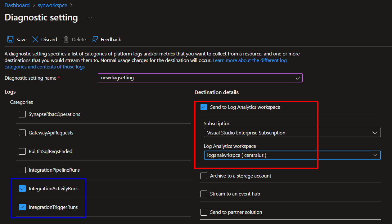 Browse to your synapse workspaceà monitoringà Diagnostic option as shown below. You can see the option Add diagnostic setting which will push all the logs from your synapse workspace to the log analytics. Below are the log categories that will be available for you to choose based on your requirement.