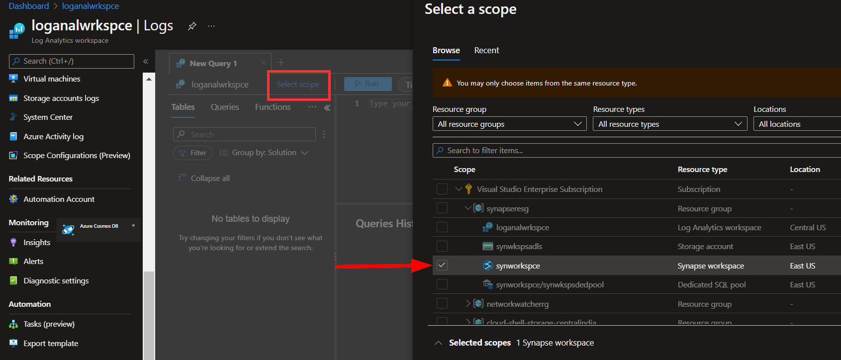 Once done now go to the log analytics workspace, General-> Logs and select the scope. Once this is done, we have the integration complete between the synapse workspace and the log analytics workspace but you wouldn’t be able to see any logs simply because the pipelines has not been triggered yet. The setting will only record the information of log sets of future runs but it won’t pick any historical data.