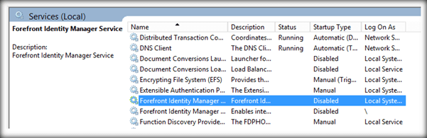 This happens mainly because the services that are required for ForeFront Identity Manager are not running in the Server. Heading over to Services.msc we can verify whether the 2 ForeFront Identity Manager Services are running.