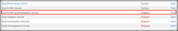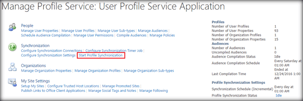 Once the User Profile Synchronization Service is started and the ForeFront Identity Manager is started, we can start the Profile Synchronization from the User Profile Service Application.