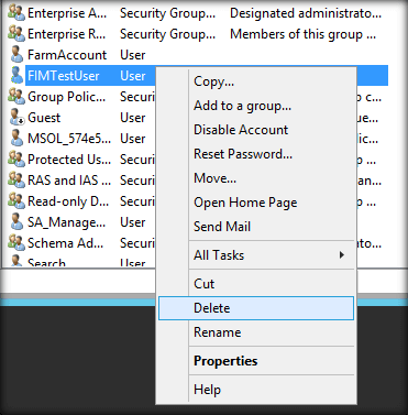 Now let’s remove the “FIMTestUser” from the AD and see how the synchronization process will happen using FIM Client. From the Active Directory users, select FIMTestUser and delete it.