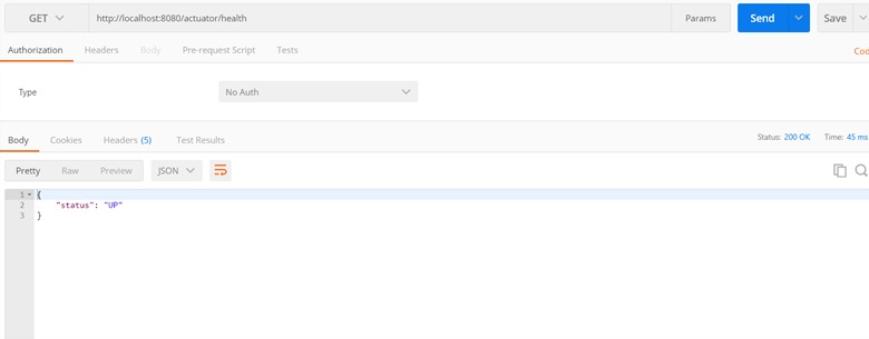 The health endpoint provides information about the health of an application. Since the service is running on my local, the endpoint is ‘http://localhost:8080/actuator/health, which results in