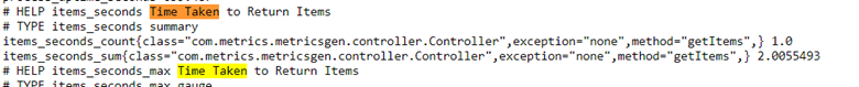 Upon searching for a String ‘Time Taken to Return Items’, but for the below metrics to generate, we need to first invoke the endpoint ‘http://localhost:8080/items’.