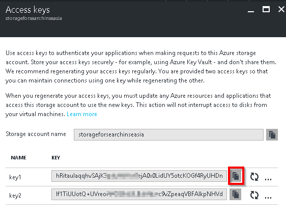 Click on the "View Access keys" for this storage account to navigate to the following blade where you can copy the Access keys.