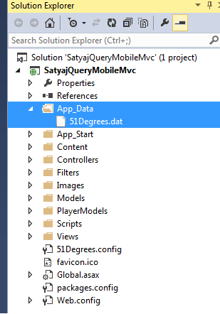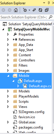 Select project template as internet application. Visual Studio 2013 adds SatyajQueryMobileMvc project in the solution, as shown in the screenshot.