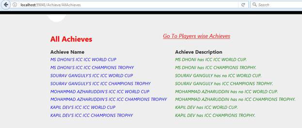 Here, MS DHONI is a Player in Player.cs and is shown in the dropdown list. The records will be shown as defined in Achieve.cs.