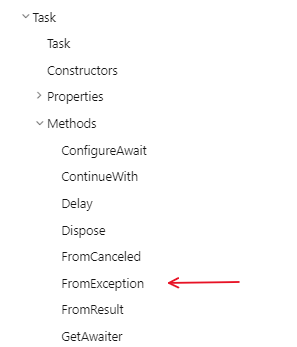 This method creates a Task object whose Status property is Faulted and whose Exception property contains exception. The method is commonly used when you immediately know that the work that a task performs will throw an exception before executing a longer code path. For an example, see the FromException<TResult>(Exception) overload.