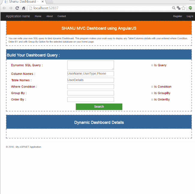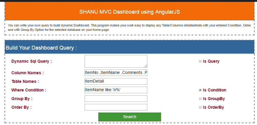 We can bind any data on our Dashboard page by entering our Select Query in this text box. We can also write our join query to display data from more than one table with where conditions. We need to first check the Is Query Checkbox for displaying our Dynamic SQL Query data on the dashboard page. If the check box is not checked then by default we will display the column and table details which we have given.