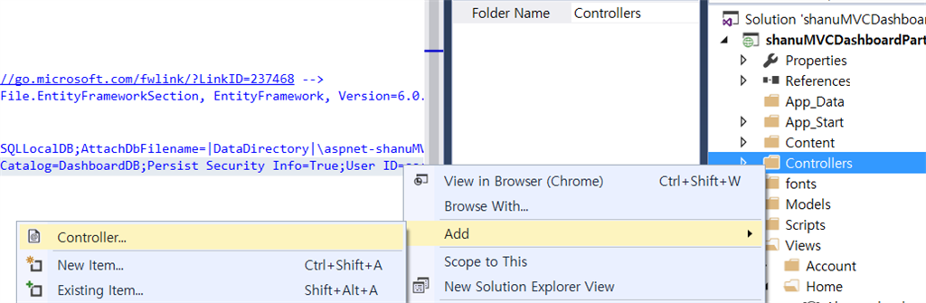 Select Web API 2 Controller – Empty and click Add. After that enter the controller name as DashboardAPIController