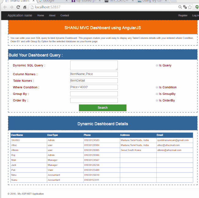 We can see from the above image, first we display the simple select query result in our dashboard page. Next, we display the combination of 2 table data using left outer join select query which will display UserName, UserType, Phone, Address, Email from userDetails and userAddress table. Here you can write your own SQL select query to display data with your where condition, Group By, Order By or Union or any other select query to be displayed.