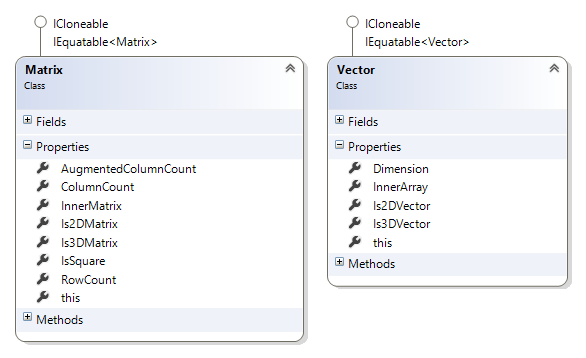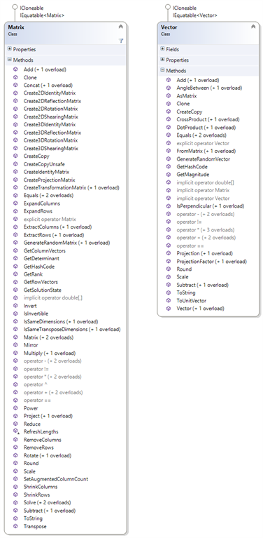 Working with raw Array objects especially multi-dimensional arrays is fairly cumbersome. To make it easier, we wrapped those raw functions into two wrapper classes, Matrix and Vector. Both classes implement ICloneable and IEquatable. Both have indexers and a direct way to access their inner representation (i.e. array).