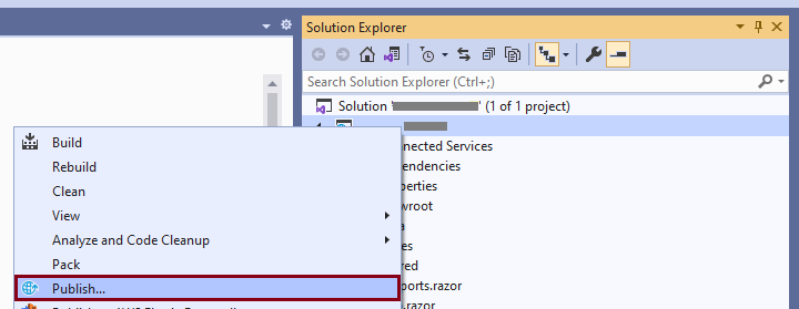 For this example, we'll deploy our web application from Visual Studio 2019. To do this, you only have to right-click on the main project and select Publish.