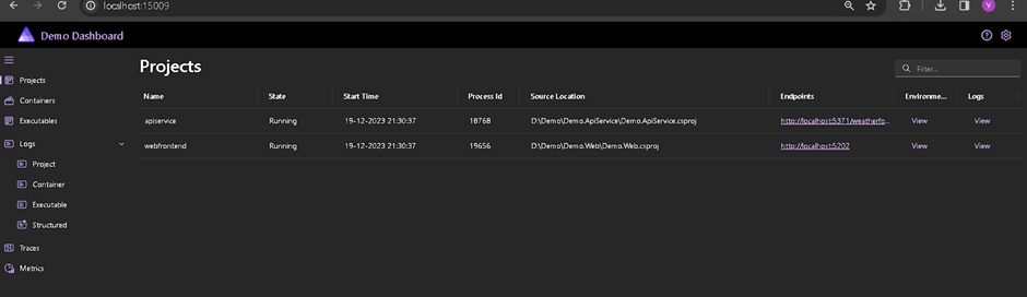 This dashboard provides an overview of the current state, start time, process ID, source location, and endpoints for each project. The "View" action at the end of each project entry likely allows users to access more detailed information or interact with the project in some way.