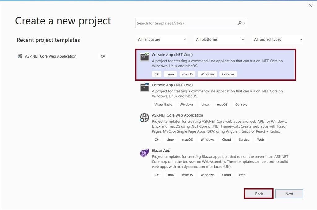 The first step will be to create a simple .NET Core console application for Windows. Start Visual Studio 2019 and select the console app. The project name is hellodotnetiot.