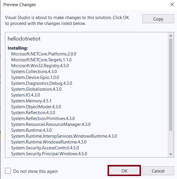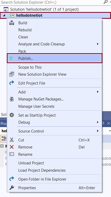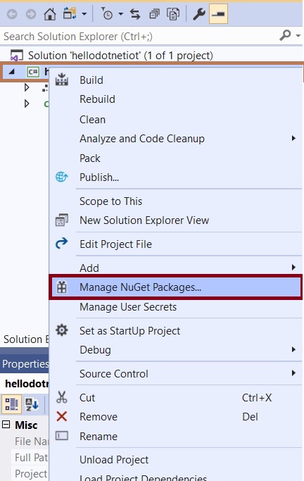 Then, you need to add the GPIO NuGet Package, so select the hellodotnetiot to right-click to more options available. Select NuGet Package and install the GPIO system configuration package.