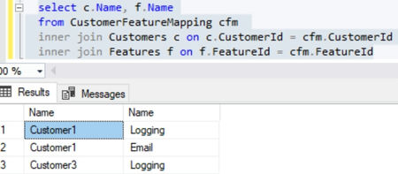 We have a SQL database with three tables Customers, Features & CustomerFeatures. Which we will use to identify if some particular feature is assigned to the logged-in customer or not: