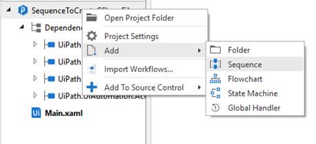 Create Process in UiPath, default main sequence will be created but add new sequence “Create VS Project”.