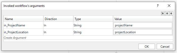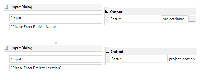We will take project name and location as input also from user, so add “Input Dialog” in Main sequence like,