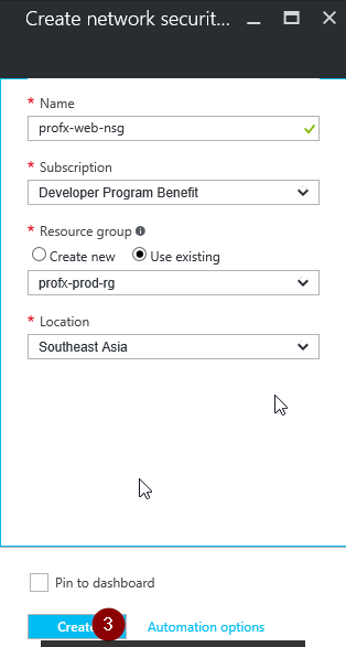 Provide a meaningful name for the NSG. In your production scenarios with different environments and multiple servers, you might have to create multiple NSGs. Please be cautious in naming the NSGs. Select the Subscription, Resource Group, and Location, based on your requirements.