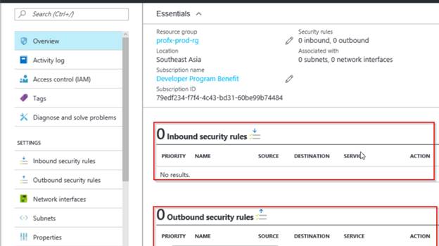 Let’s review the default Inbound Security and Outbound Security rules getting created automatically. Though the above screen shows that the count of both type of rules is Zero (0), there are three Inbound and three outbound default rules that get created when you create a Network Security Group.
