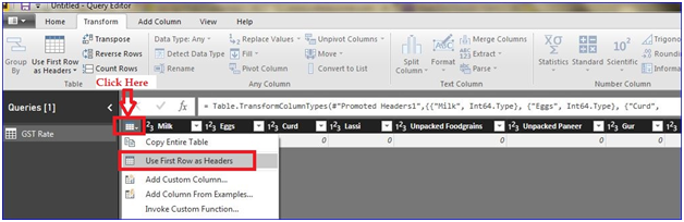 We can change the name of column by clicking on Use First Row as Headers. This option comes after clicking on table icon of table as below. After using this option the name of column become the column data as available. It is shown in below image.