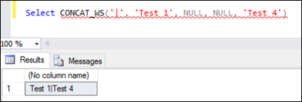 - Select CONCAT_WS('|', 'Test 1', NULL, NULL, 'Test 4')