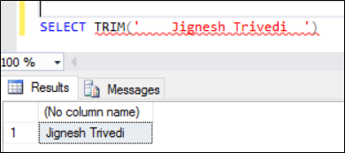 It removes the space character or specified character from input string at the beginning and end of a string. It returns character expression with same type of input string. It returns NULL if the input string value is NULL. It is equivalent to LTRIM(RTRIM(@inputstring)). The behaviour with specified characters of this function is the same as the behavior of the REPLACE function where character from beginning and end are replaced with an empty character.