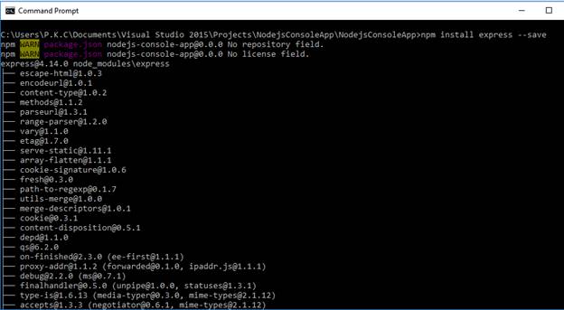 When you open your project structure, you will find that a new directory “node_modules” has been added and this directory contains a sub directory named as “express”. It indicates that the Express dependencies has been installed successfully in your project.