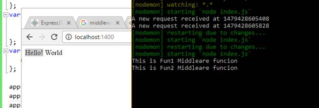 In this example. we have created two middleware functions that execute or run before the response is sent to the client. Each middleware function contains three parameters. First parameter denotes the request object, second parameter denotes the response object, and the last parameter denotes the next middleware function.