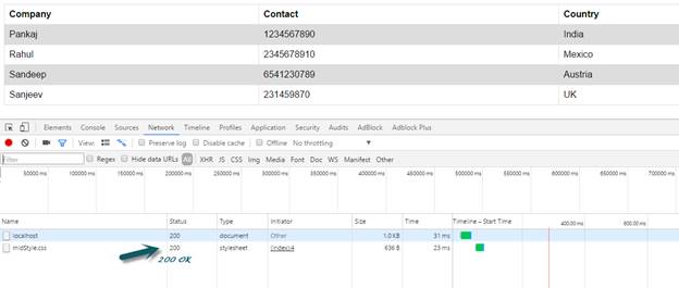You can see that we get table formatted data that we send as read from the “index.html” page, but it doesn’t contain the style properties that we defined. So, what is going wrong? Let’s check the issue. Now, right click on page and click on “Inspect Element”. In Network section, you will find that for “midStyle.css”, we are getting “404 Not Found” error.