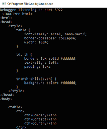 In the example mentioned above, we create a Web client, define the Server name, path and port names in “options” variable. We define the callback function, which will return the data returned from the Server, if request executes successfully. At the end of the code, we send the request to the Server. Now, run the code mentioned above. When you run this code, you will text formatted data written in index.html file.