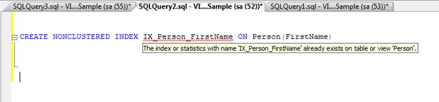If we try to create a Non Cluster Index with the same name we will get an error. When we move the cursor on the index name we can see the alert message like the below screen shot.