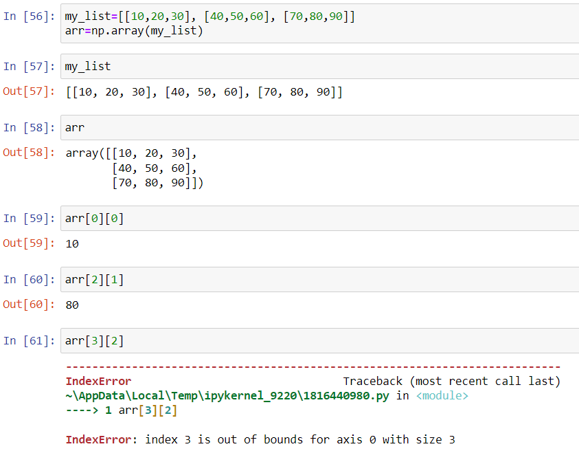 arr[3][2] #Gives Error! Because no such element exists, we 3 rows (index-0,1,2) and 3 columns only (index-0,1,2). So, by [3][2], we mean 4th row and 2nd column which does not exist, hence the error.