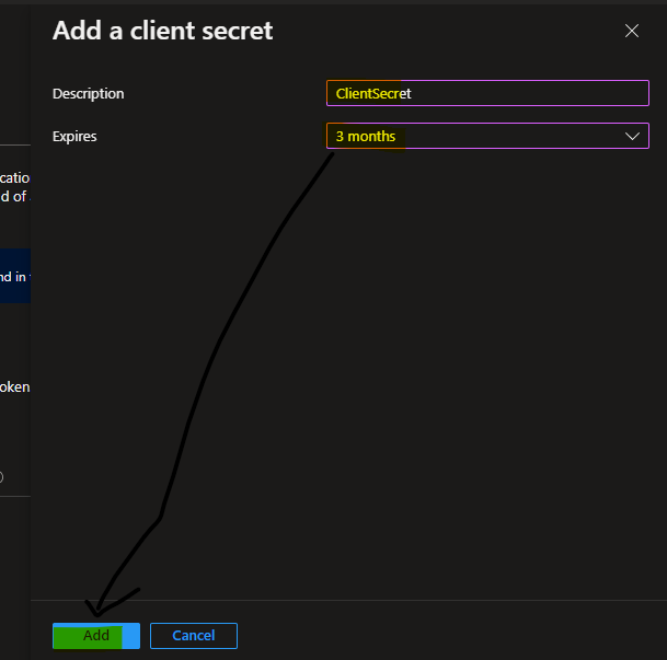 Go to Certificates and Secrets-> Click on New client secret-> A popup will show, provide description and select the expiration time as I have selected 3 months-> Click on Add button.