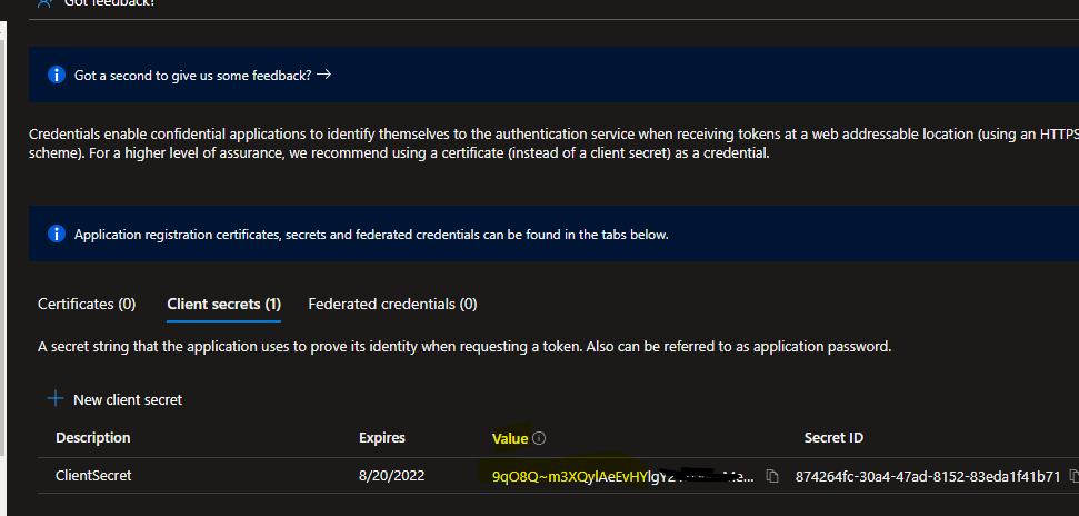 Copy the Secret value and keep it somewhere as it will also be used later.