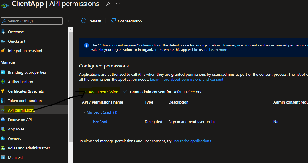 The access we have added is not granted by default, so for granting the access click on the ‘Grant admin consent for Default Directory’-> A popup will show to yes or no, click on Yes button.