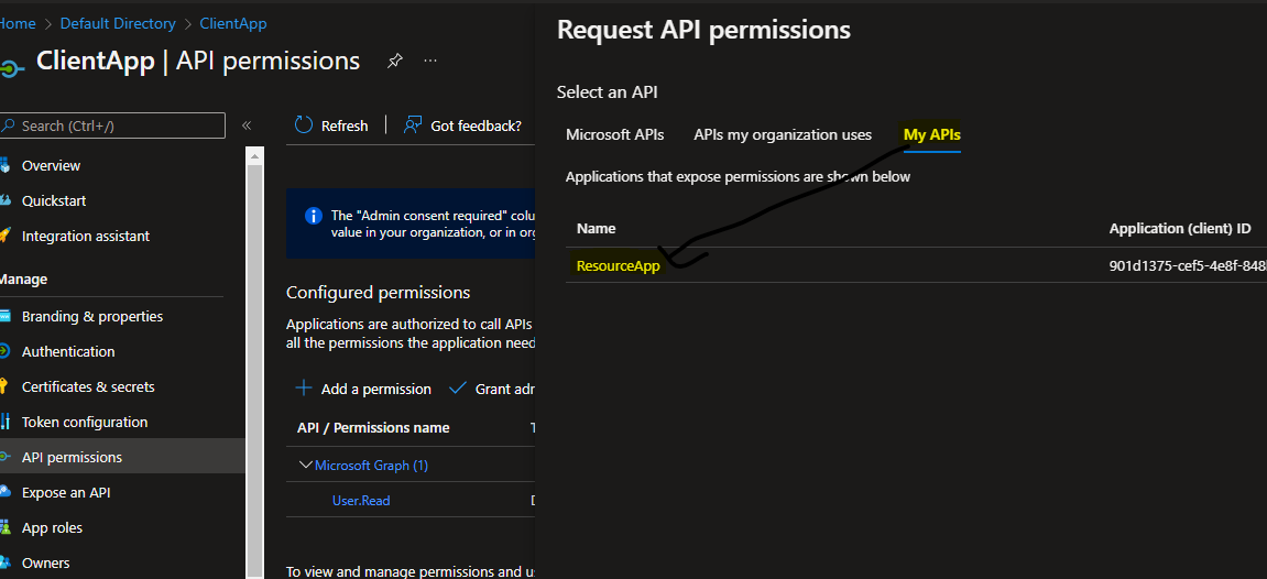 Go to the API permission-> Click on Add a permission-> A popup will show with three tabs, select the last tab My APIs-> you will see the ResourceApp which we have created in the first step-> select this ResourceApp, A popup will appear to check the permission(If you noticed, it is the role APIAccess which we have added into ResouceApp)-> Click on checkbox-> Click on Add permission button.