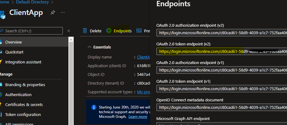 Go to the Overview of ClientApp-> Click on Endpoints-> collect the OAuth 2.0 token endpoint(v2) and keep it in notepad.
