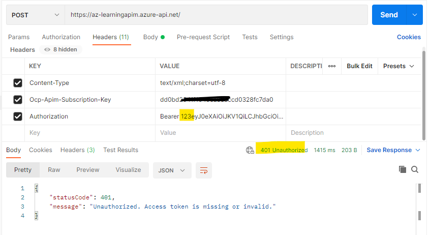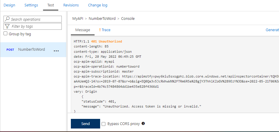 See, you will get 401 Unauthorized and the message “Unauthorized. Access token is missing or invalid.” That we have set in the policy.