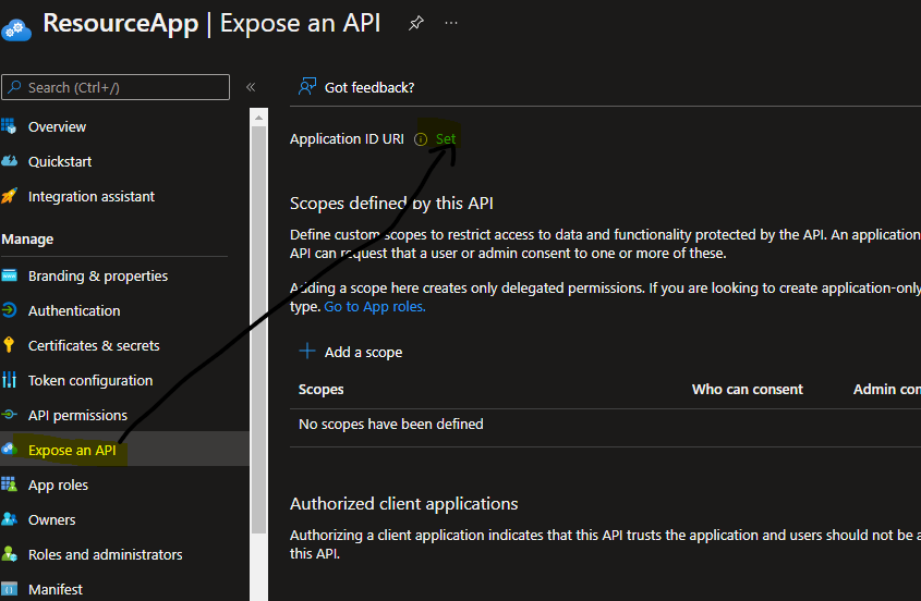Now go to the Expose API-> click on set to set the App URI-> there will be a popup, copy the app URI, put it somewhere and click on Save button.