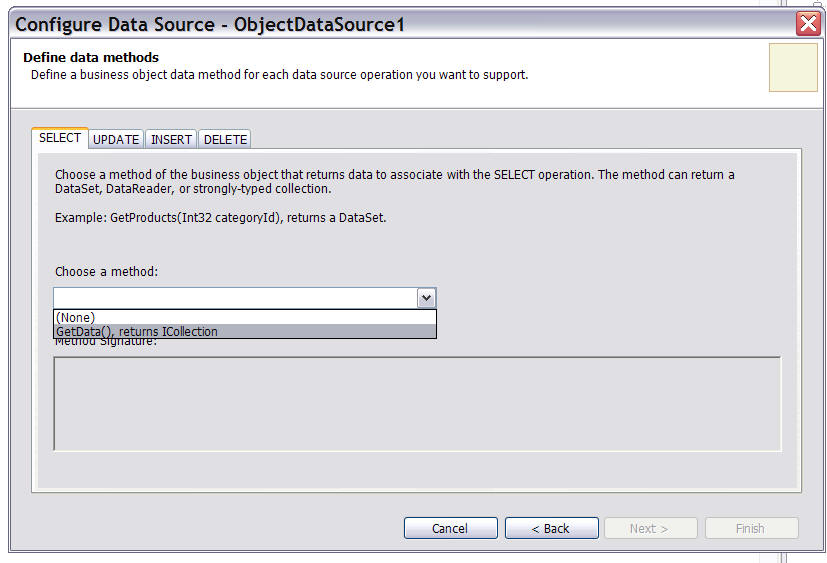 You can also select the methods that can be used instead of SELECT, UPDATE, INSERT, and DELETE queries. As you may have noticed we had a method GetData in our BusinessHelper class. This method is available on next page of Configure Data Source dialog. See Figure 3.