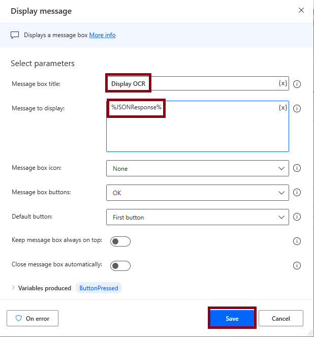 For Displaying Result, Add the Display message action and Set the Message box Title Parameter as Display OCR Result, Message to display Parameter as %JSONResponse% Click Save Button